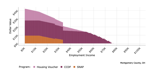 Picture a mom raising two kids in Montgomery County, Ohio, receiving SNAP, Section 8 Housing, and child care benefits. If her income increases from $33,000 to $34,000, she faces a loss of $4,664 in federal resources. What should have been a $1,000 raise becomes an $3,664 loss. The system forces Americans facing the benefits cliff to logically choose to reject opportunity because accepting it would ironically create financial hardship.